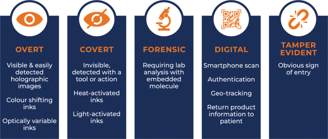 Anti-counterfeiting features may be both overt and covert and can be applied in many ways. These include in-product, on-product in the form of labels and closure seals, on cartons where containers of products are stored, into plastic parts of individual packaging, and even onto metal and glass components of packaging.